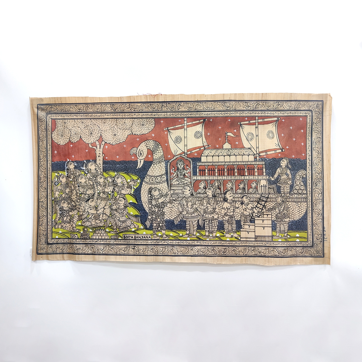 These are exotic ancient painting on tussar (silk) which is a natural fabric or on hand made canvas (Patta). As a religion art form it evolved from the temple rituals, more specifically from the temple of Jagannath at Puri and else where in Orissa. These paintings portray a large variety of themes, from religious and mythical stories to exotic and raga (musical) narratives.