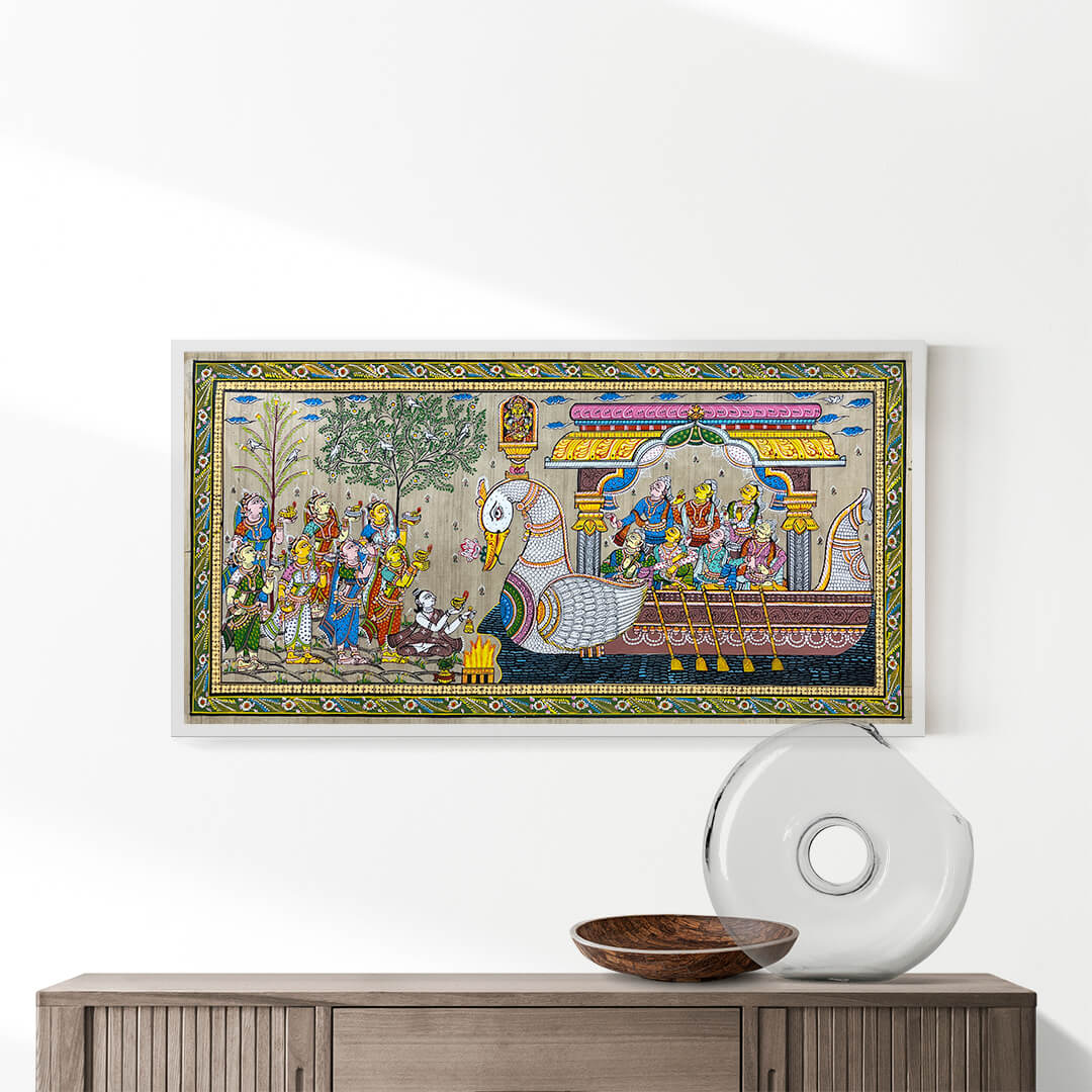 These are exotic ancient painting on tussar (silk) which is a natural fabric or on hand made canvas (Patta). As a religion art form it evolved from the temple rituals, more specifically from the temple of Jagannath at Puri and else where in Orissa. These paintings portray a large variety of themes, from religious and mythical stories to exotic and raga (musical) narratives.