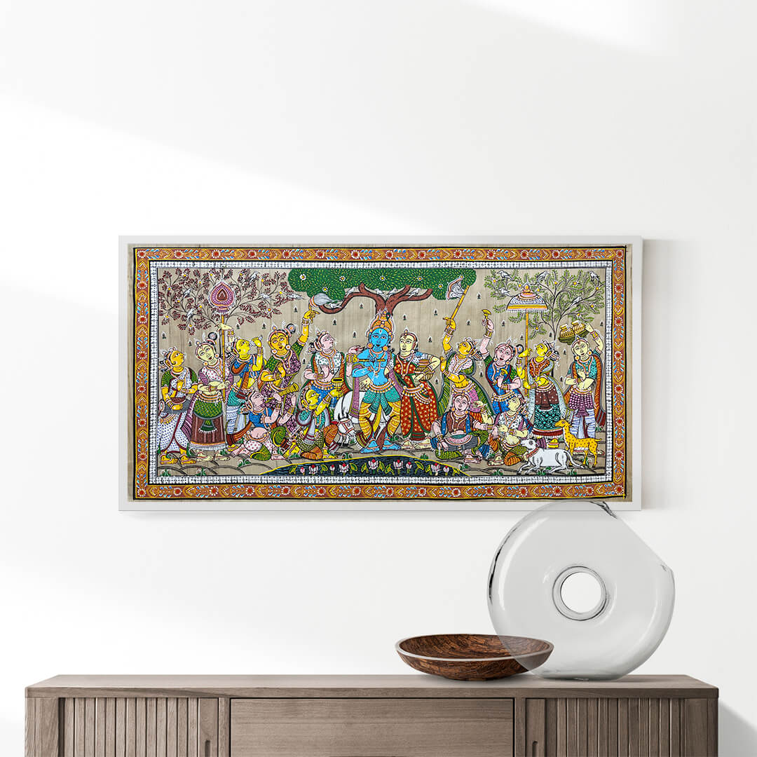 These are exotic ancient painting on tussar (silk) which is a natural fabric or on hand made canvas (Patta). As a religion art form it evolved from the temple rituals, more specifically from the temple of Jagannath at Puri and else where in Orissa. These paintings portray a large variety of themes, from religious and mythical stories to exotic and raga (musical) narratives.