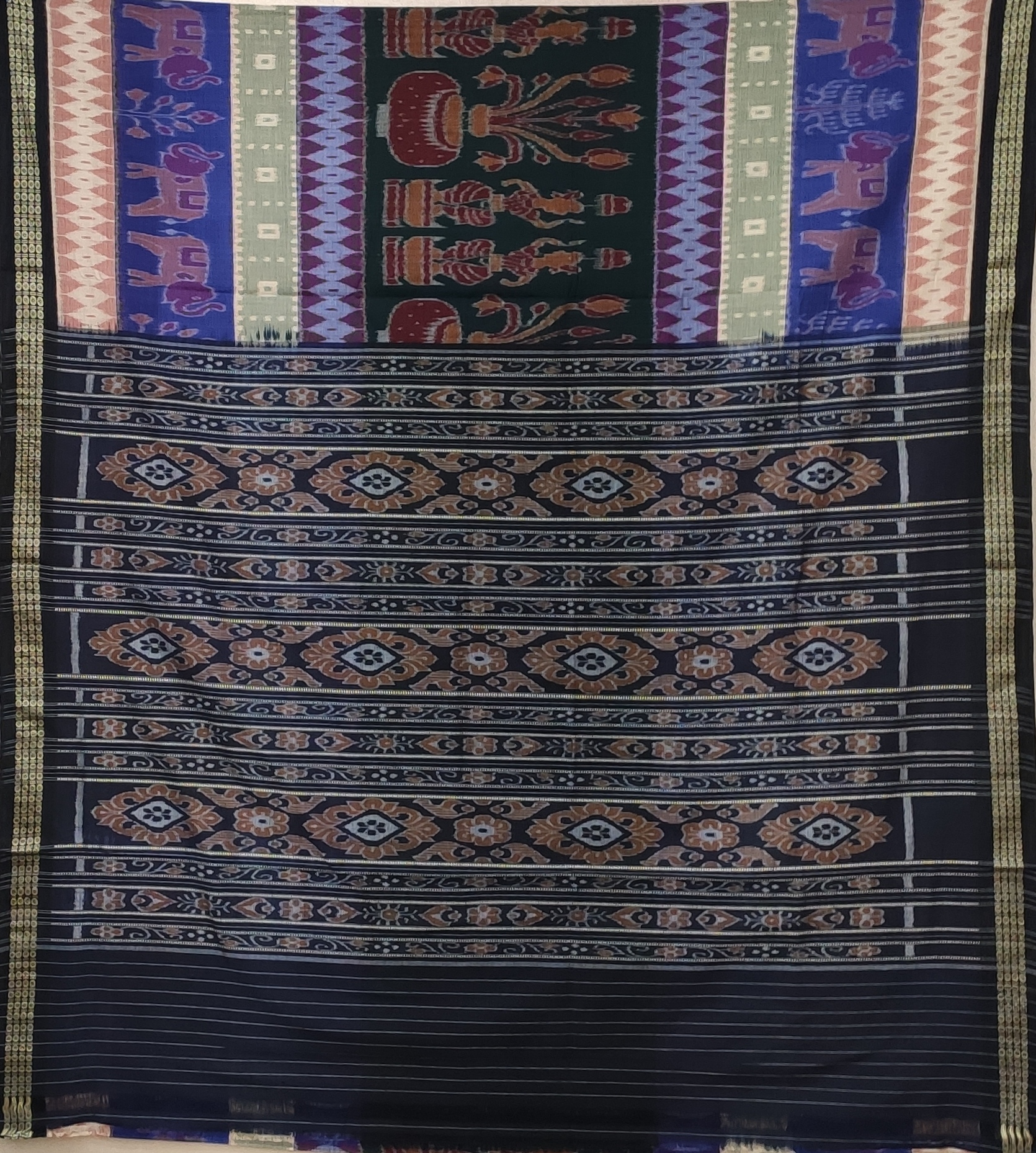 Nuapatna is a traditional Cotton saree produced from Odisha. This Saree Mehendi Green & Red in Body Colour With Black Border & Pallu.