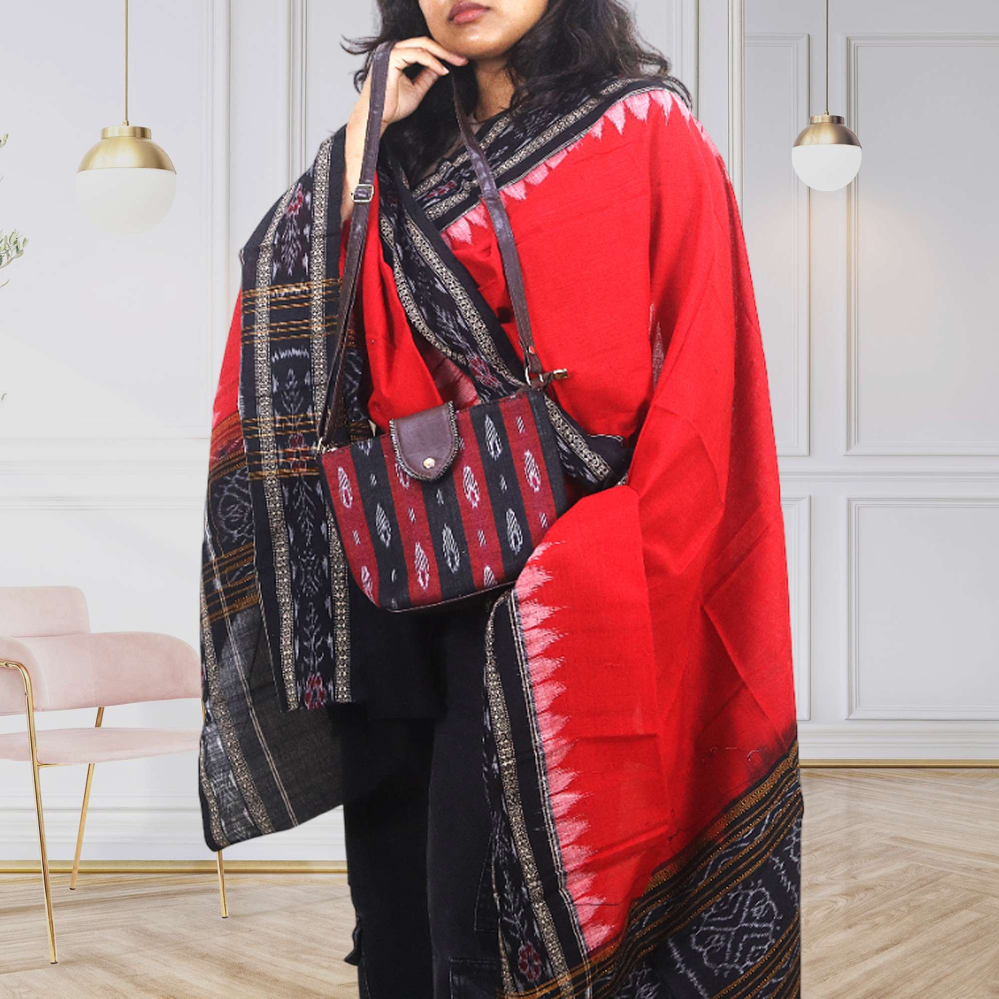 A stylish handloom sling bag with traditional Ikat weaving in red and black tones. Lightweight, eco-friendly, and perfect for everyday essentials.
