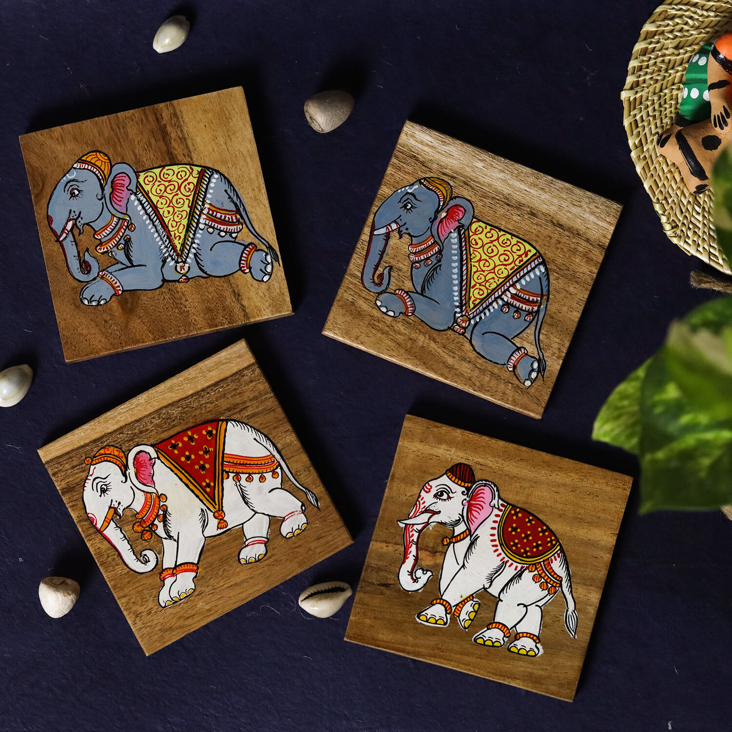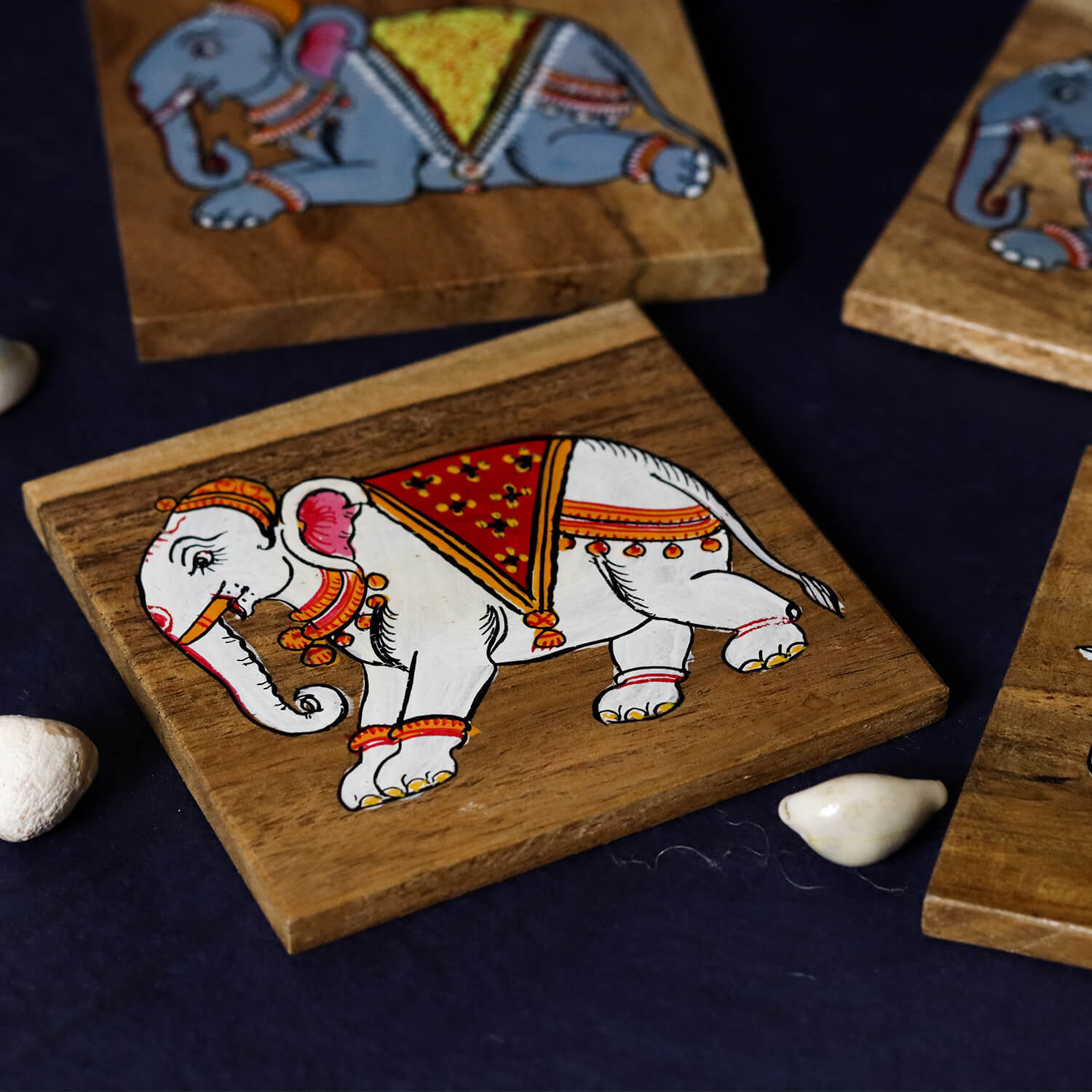 - Beautifully hand-painted Wooden Pattachitra Coasters with Elephant pattachitra art.