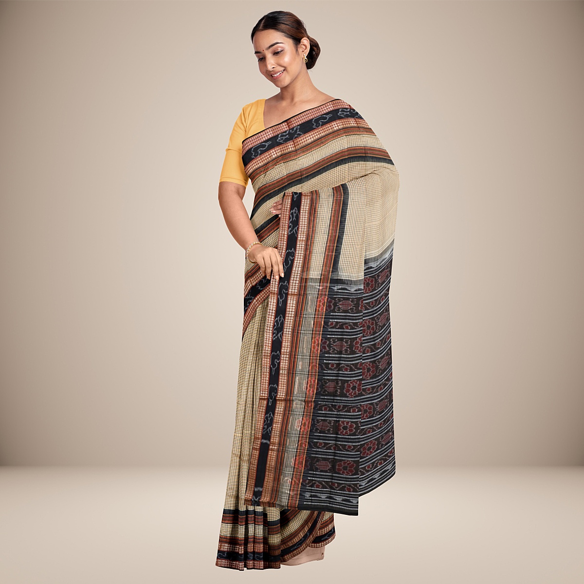 Sambalpuri saree is a traditional handwoven ikat or sari wherein the warp and the weft are tie-dyed before weaving. This particular gorgeous Sambalpuri cotton saree comes with a blouse piece..