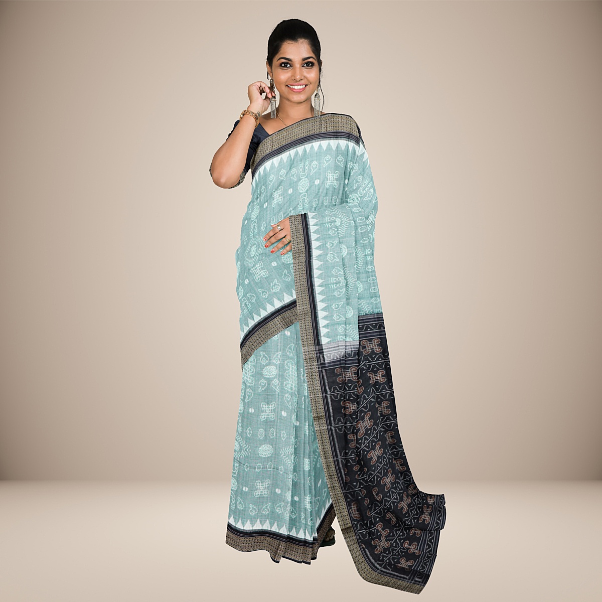 Sambalpuri saree is a traditional handwoven ikat or sari wherein the warp and the weft are tie-dyed before weaving. This particular gorgeous Sambalpuri cotton saree comes with a blouse piece..