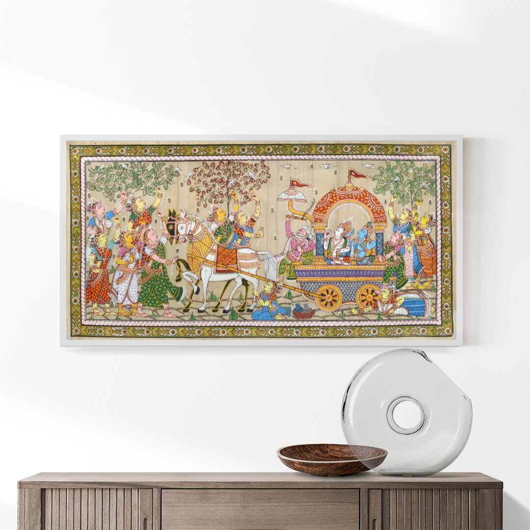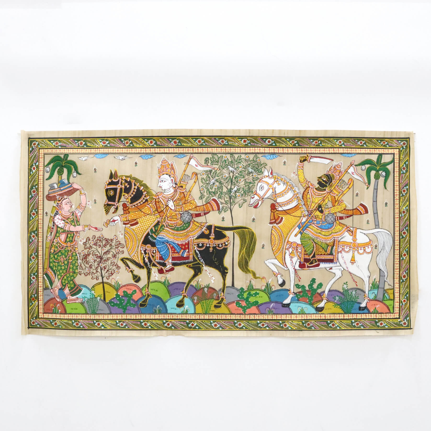 These are exotic ancient painting on tussar (silk) which is a natural fabric or on hand made canvas (Patta). As a religion art form it evolved from the temple rituals, more specifically from the temple of Jagannath at Puri and else where in Orissa. These paintings portray a large variety of themes, from religious and mythical stories to exotic and raga (musical) narratives.