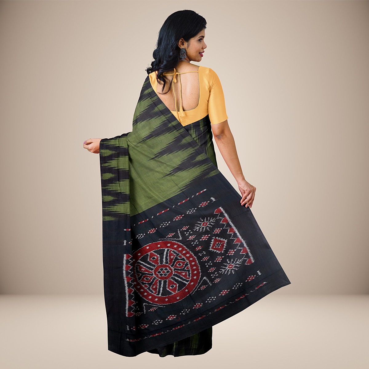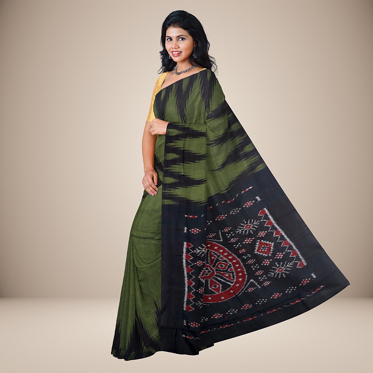 Despite its name, ‘Kargil Kumbha’ sarees pay homage to the rustic charm of handloom tradition in Odisha, not the icy mountains. Each Kargil Sarees features a Konark wheel motif on the pallu, surrounded by intricate woven designs of peacocks, butterflies, and flowers. Elevate your style with this exquisite blend of tradition and elegance.