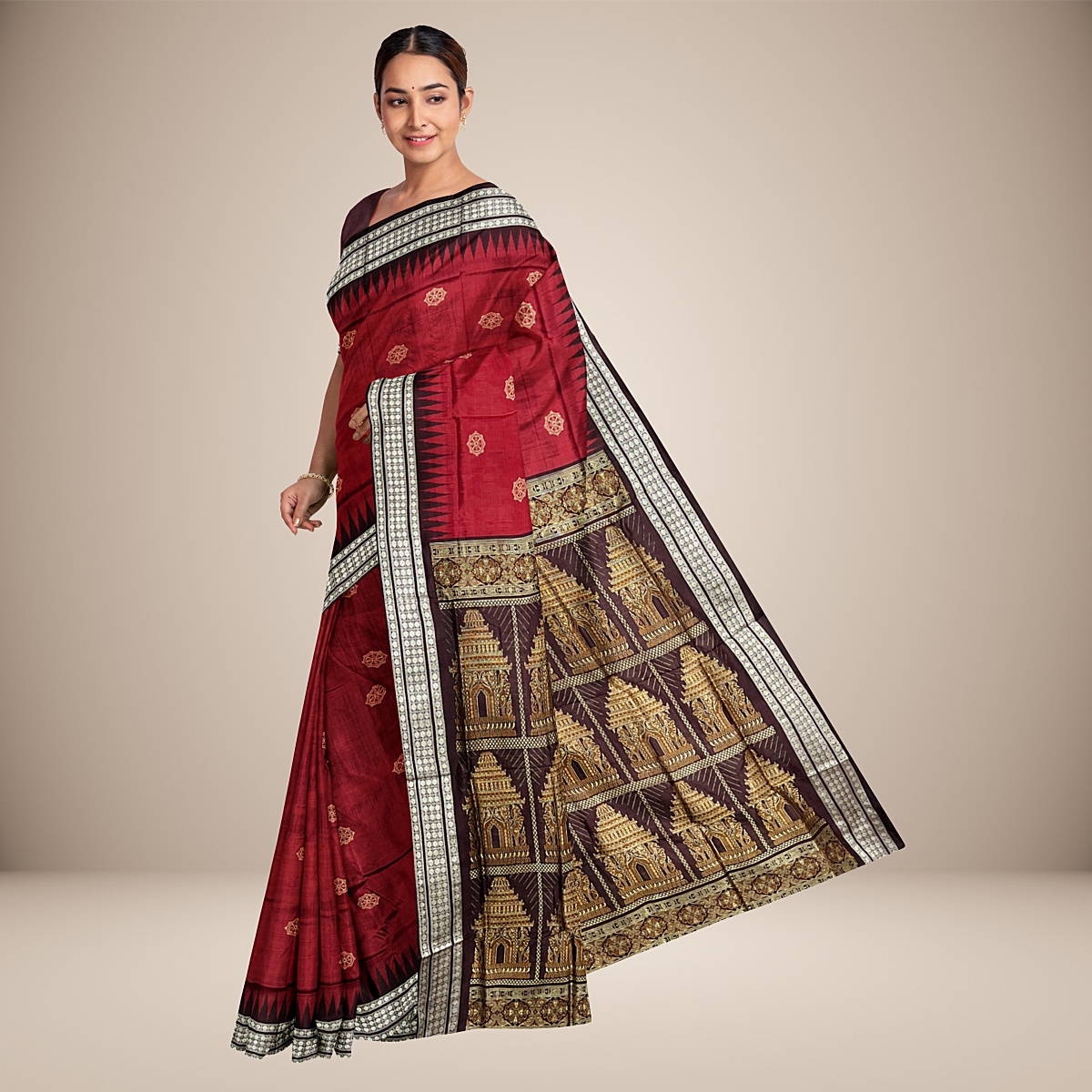 Bomkai saree is named after a small picturesque village in the Ganjam district called Bomkai. It is also known as the Sonepuri saree and is highly regarded for its exquisite woven fabric and artwork. Another feature that distinguishes Bomkai Sarees is the incorporation of mythological scenes and historical stories. It is also worth noting that Bomaki sarees feature the use of contrasting colours and nature-inspired motifs. The well-known Bomkai or Sonepuri is regarded as one of the most treasured pieces of clothing and is a must-have in every woman’s wardrobe.