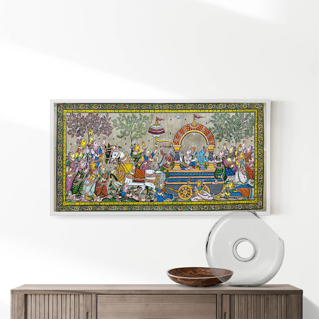 These are exotic ancient painting on tussar (silk) which is a natural fabric or on hand made canvas (Patta). As a religion art form it evolved from the temple rituals, more specifically from the temple of Jagannath at Puri and else where in Orissa. These paintings portray a large variety of themes, from religious and mythical stories to exotic and raga (musical) narratives.