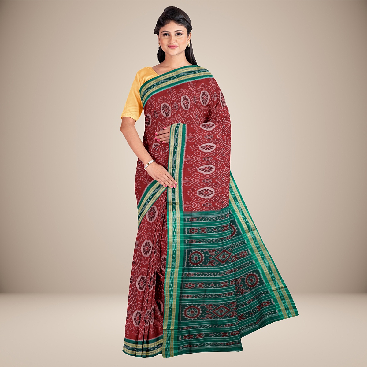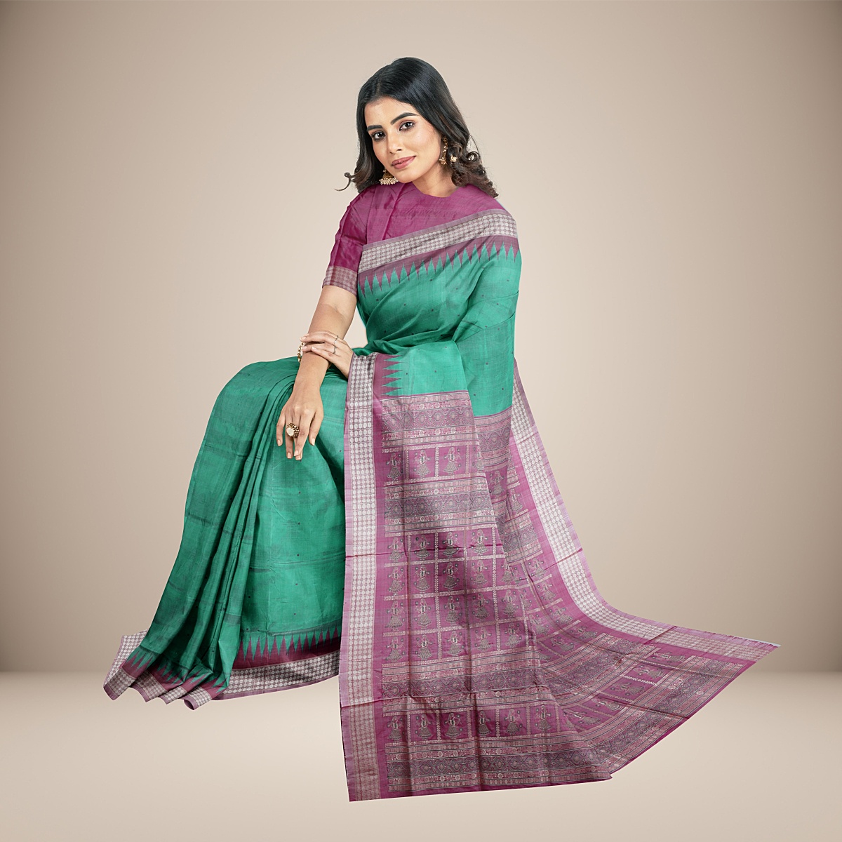 Bomkai saree is named after a small picturesque village in the Ganjam district called Bomkai. It is also known as the Sonepuri saree and is highly regarded for its exquisite woven fabric and artwork. Another feature that distinguishes Bomkai Sarees is the incorporation of mythological scenes and historical stories. It is also worth noting that Bomaki sarees feature the use of contrasting colours and nature-inspired motifs. The well-known Bomkai or Sonepuri is regarded as one of the most treasured pieces of clothing and is a must-have in every woman’s wardrobe.