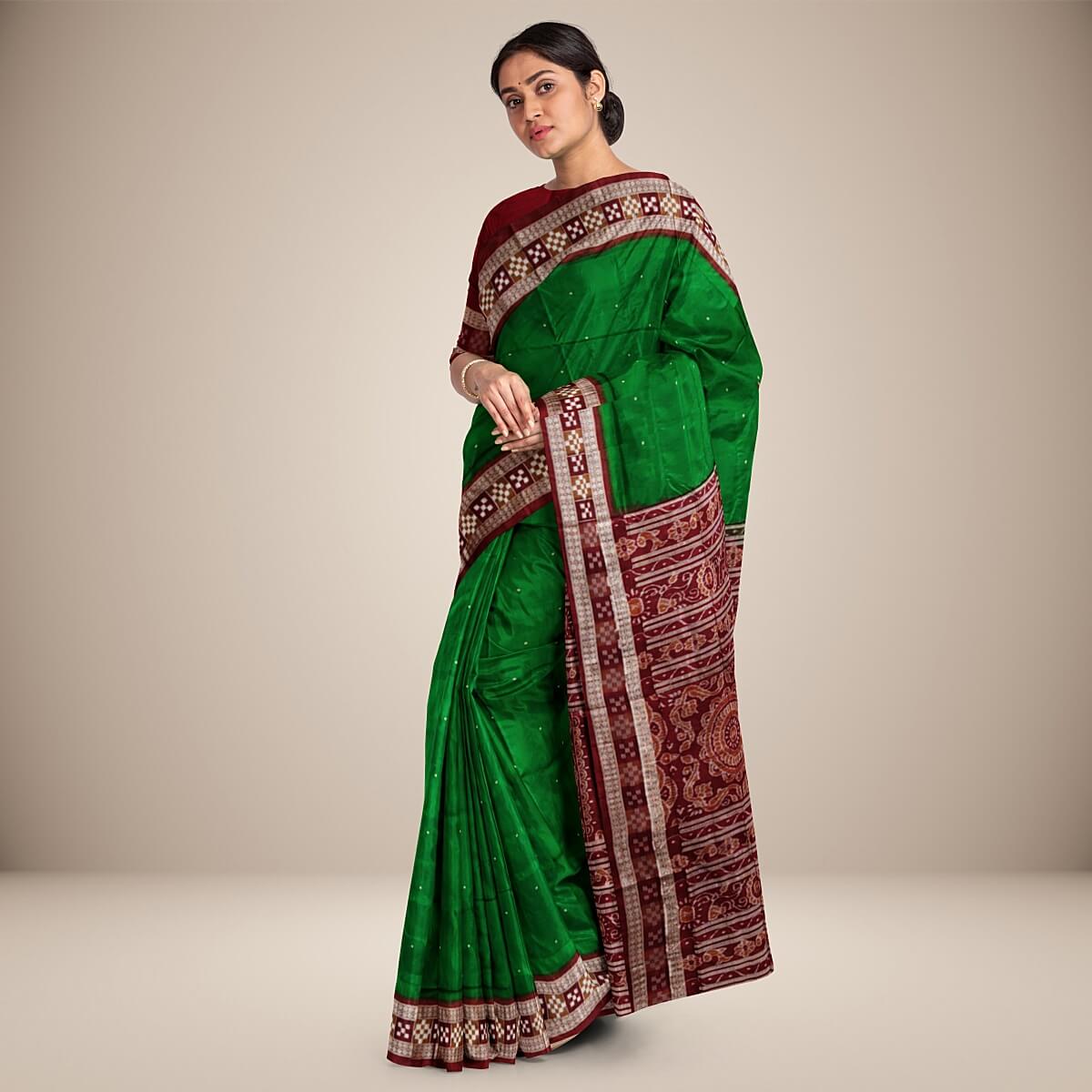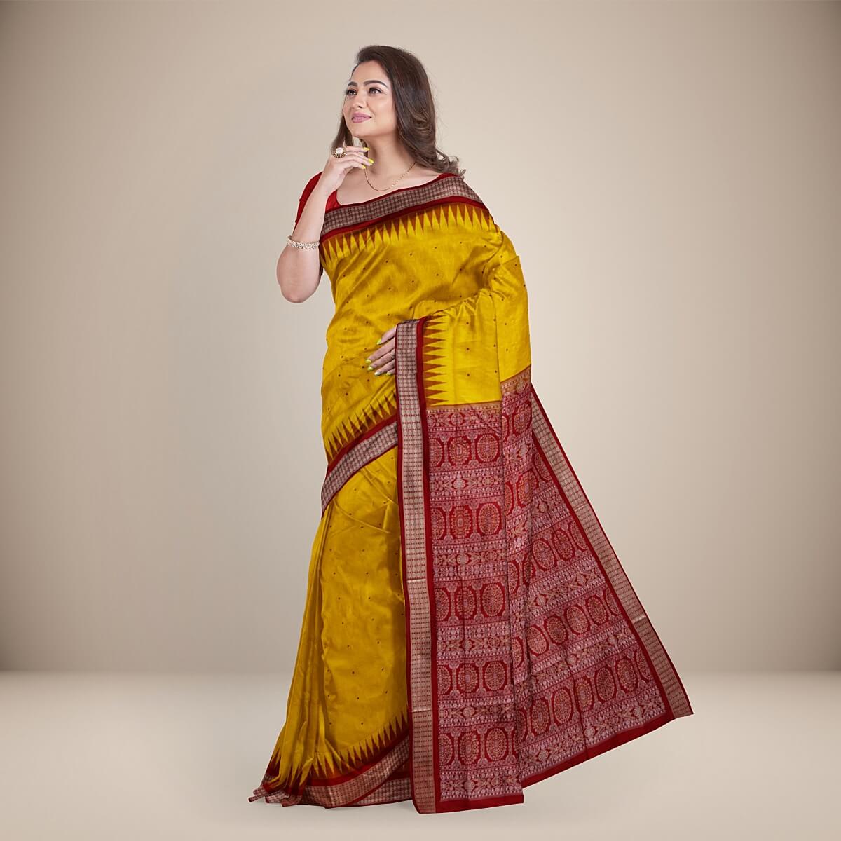 Bomkai saree is named after a small picturesque village in the Ganjam district called Bomkai. It is also known as the Sonepuri saree and is highly regarded for its exquisite woven fabric and artwork. Another feature that distinguishes Bomkai Sarees is the incorporation of mythological scenes and historical stories. It is also worth noting that Bomaki sarees feature the use of contrasting colours and nature-inspired motifs. The well-known Bomkai or Sonepuri is regarded as one of the most treasured pieces of clothing and is a must-have in every woman’s wardrobe.
