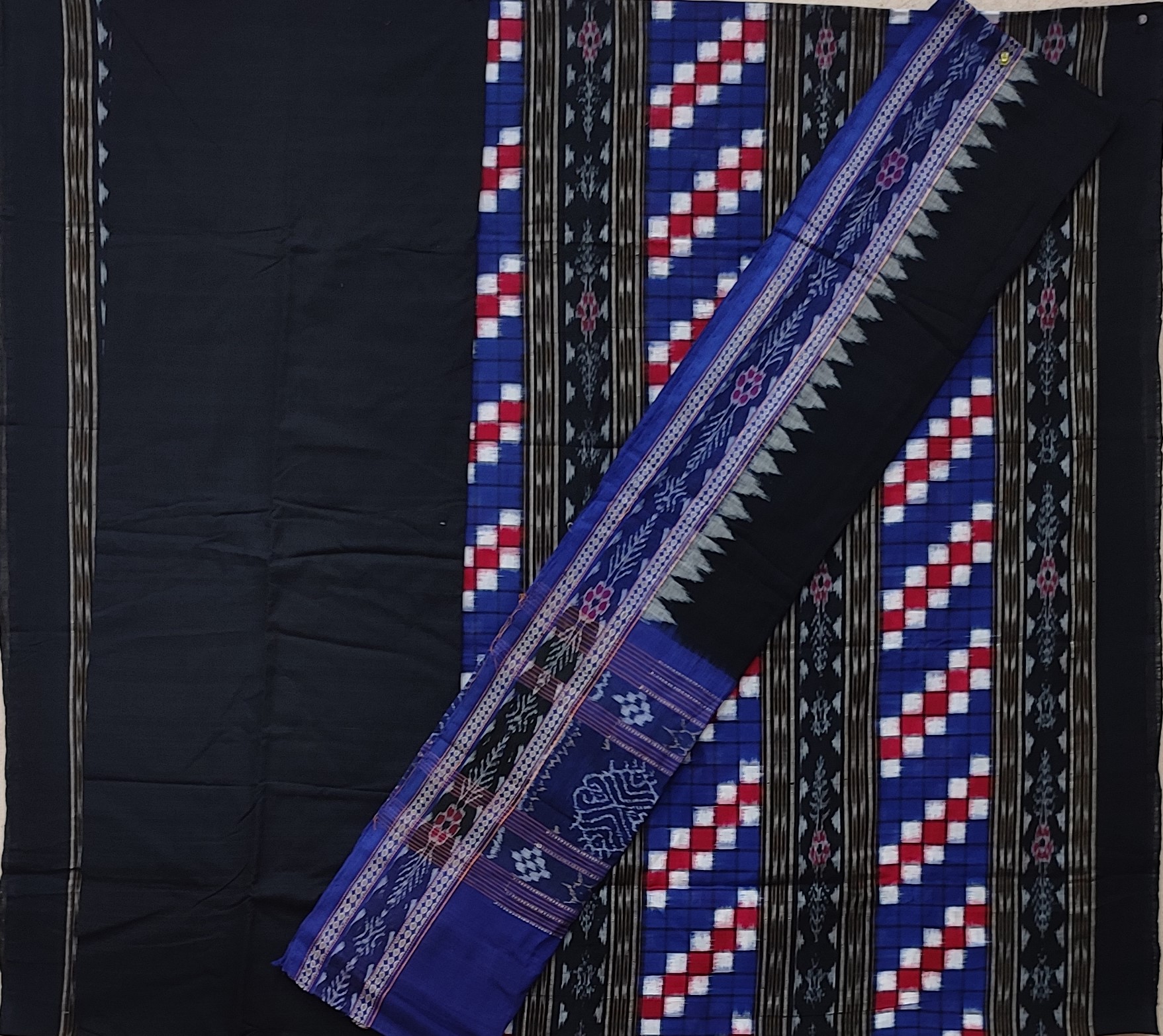 Nuapatana Handwoven Traditional Dress Set Black & White thread work in Body Colour With White Bottom. With Blue White mix bandha design dupatta.