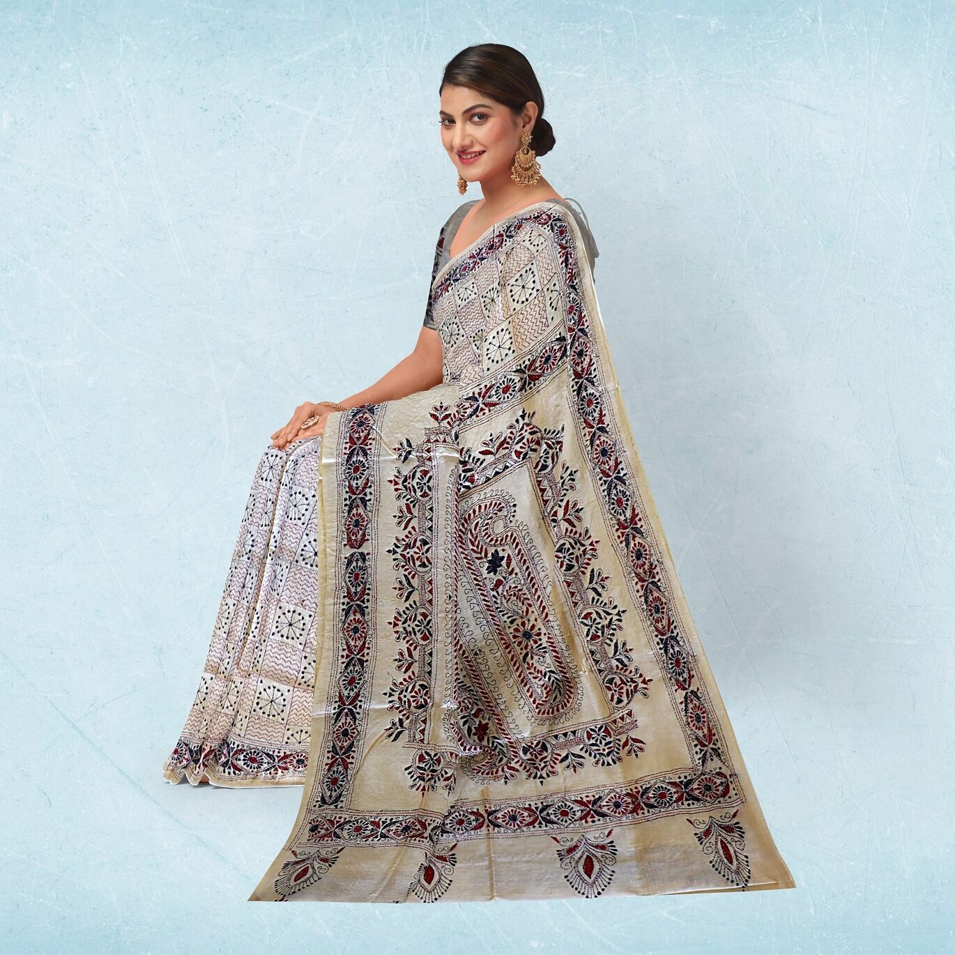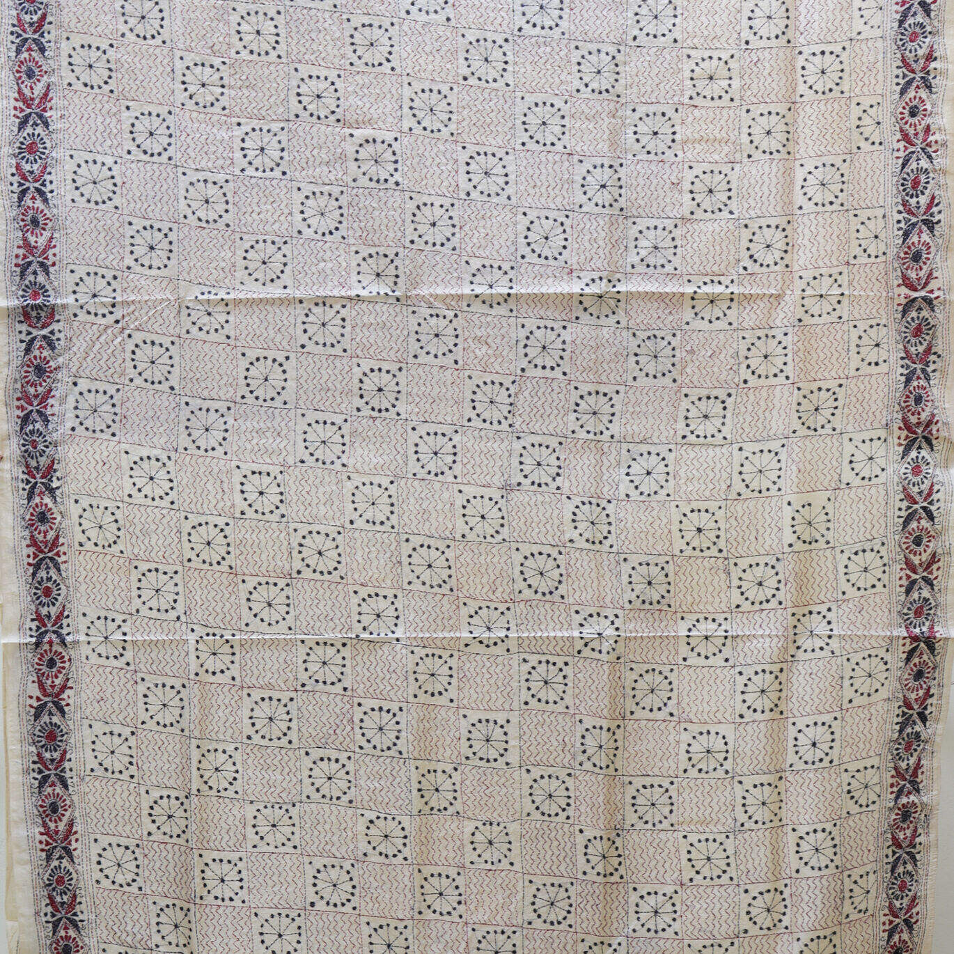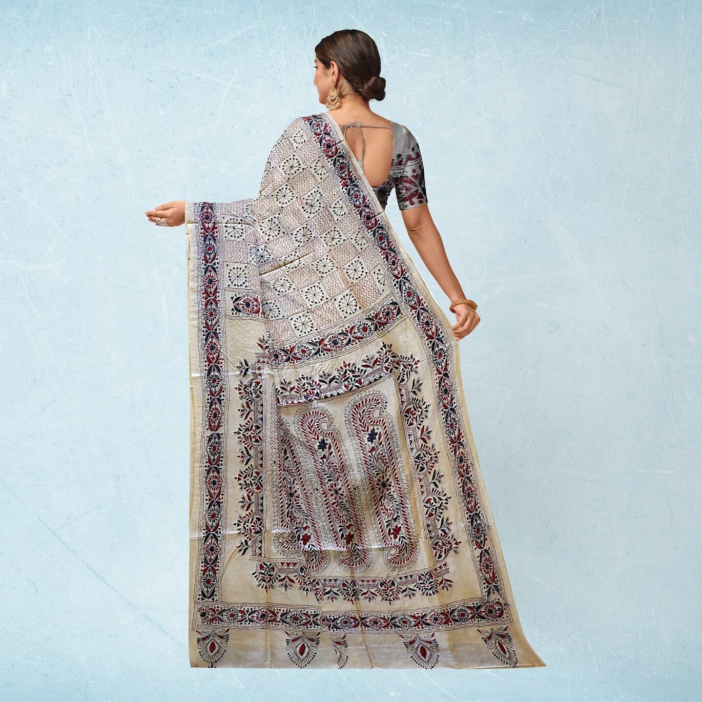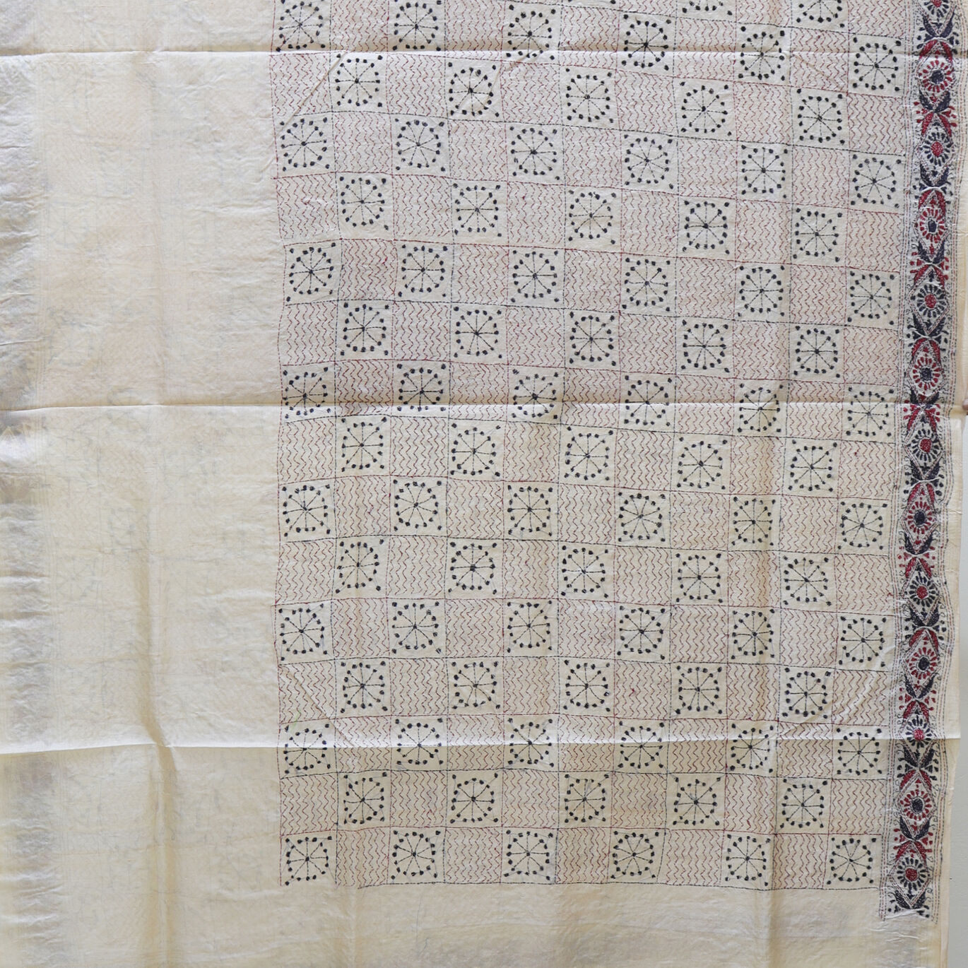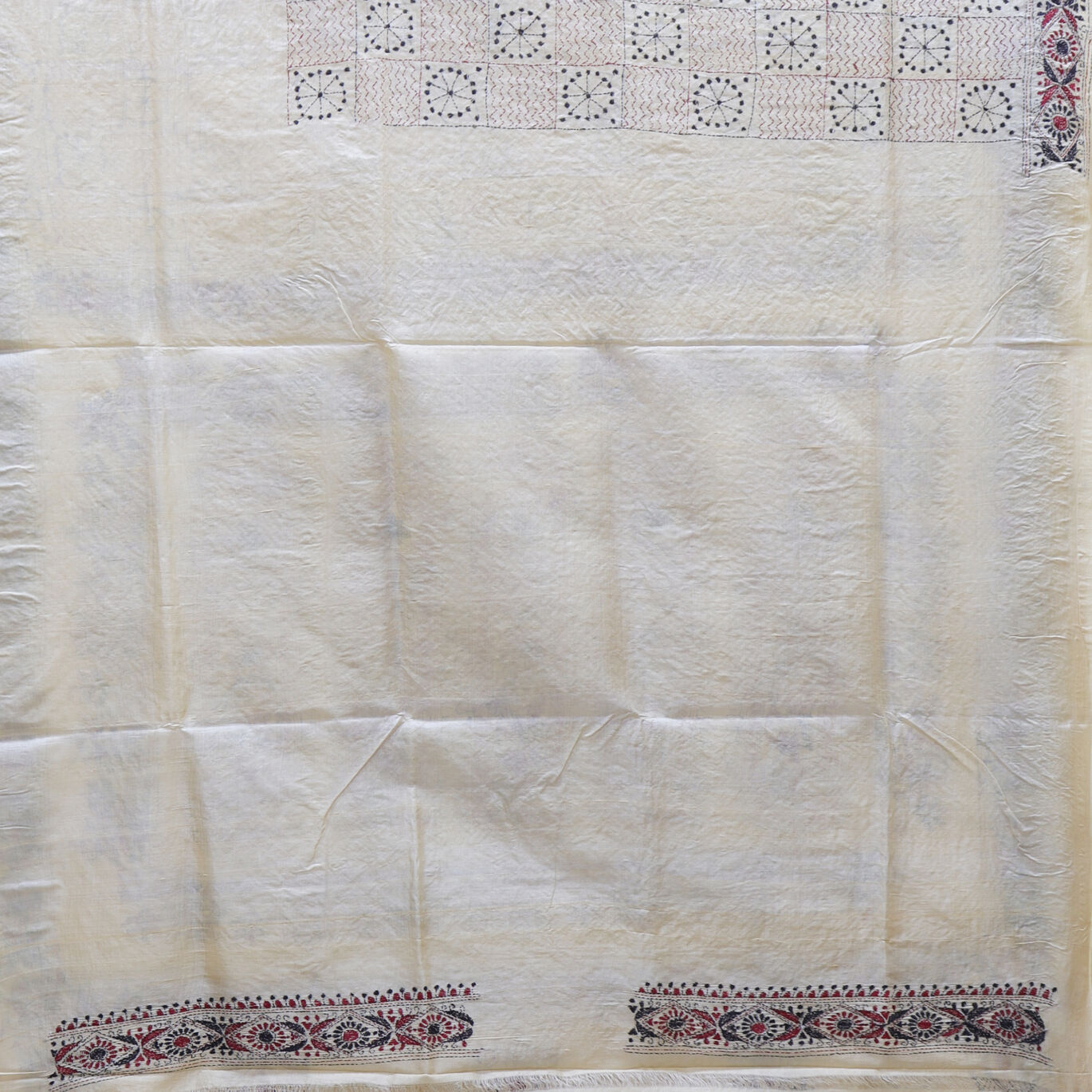 Pastel Gray Kantha Stitch Tussar Silk Saree