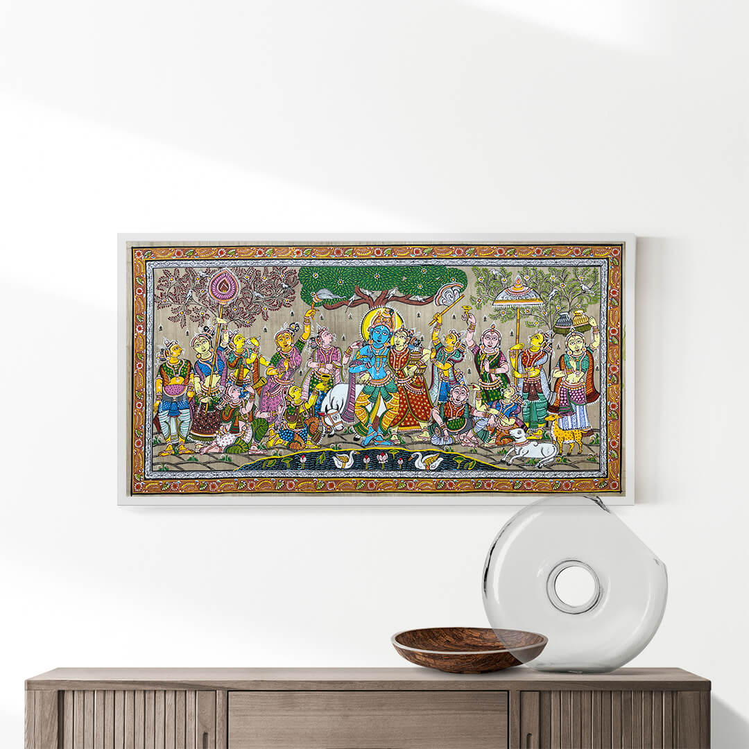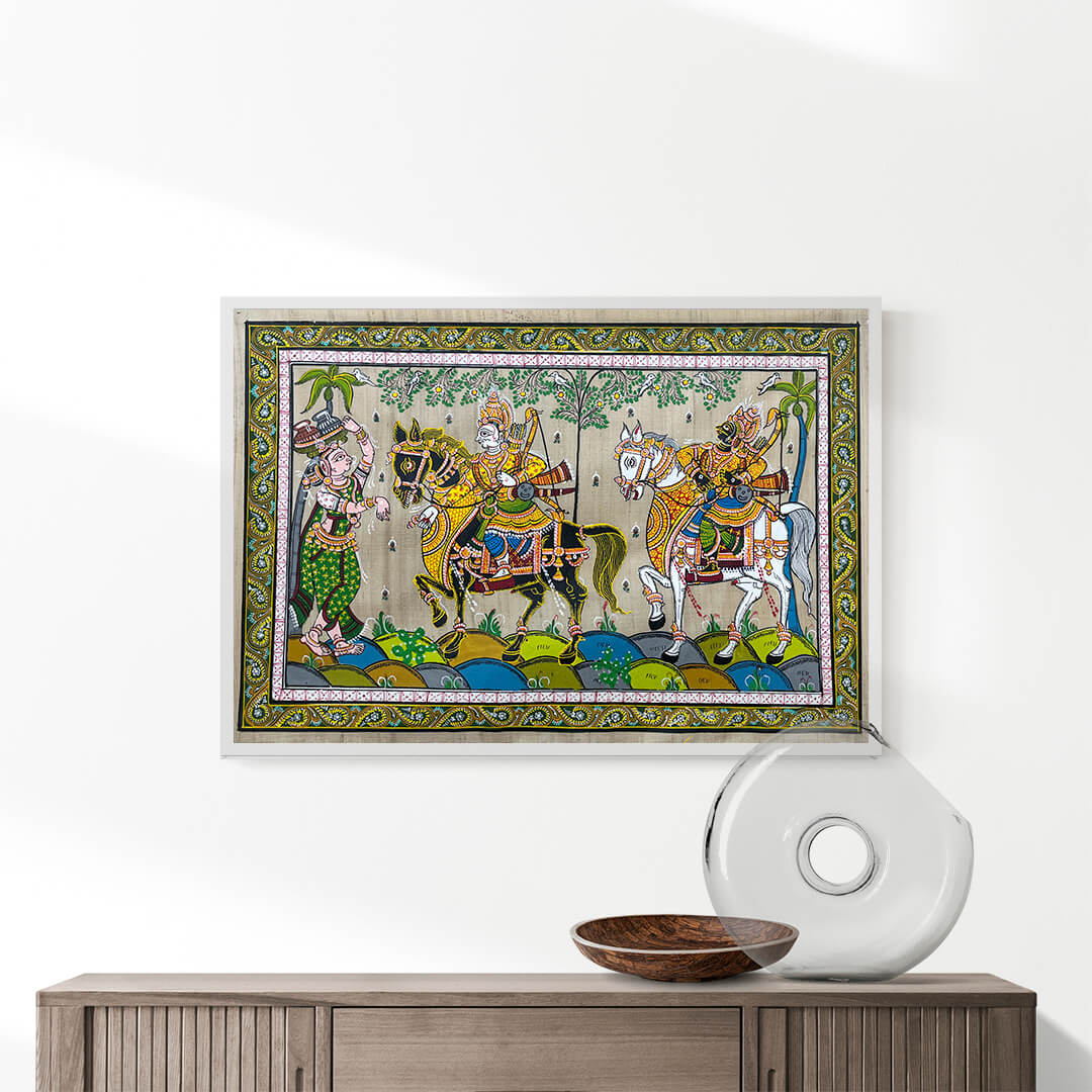 These are exotic ancient painting on tussar (silk) which is a natural fabric or on hand made canvas (Patta). As a religion art form it evolved from the temple rituals, more specifically from the temple of Jagannath at Puri and else where in Orissa. These paintings portray a large variety of themes, from religious and mythical stories to exotic and raga (musical) narratives.