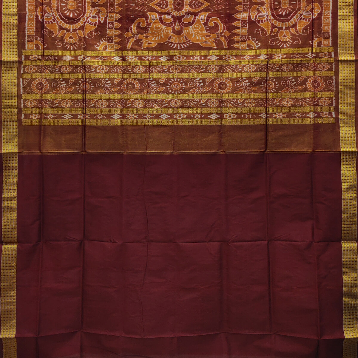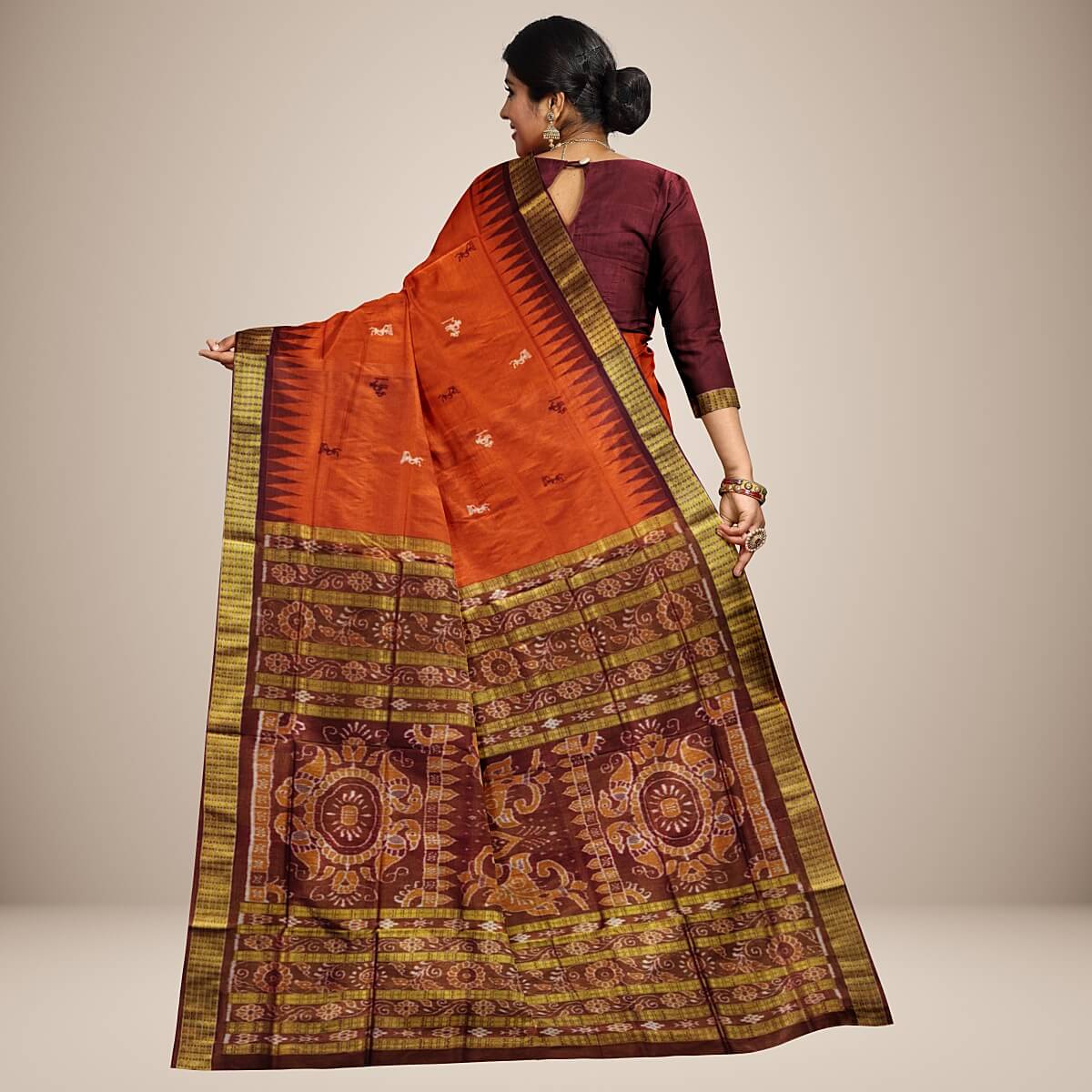 Bomkai saree is named after a small picturesque village in the Ganjam district called Bomkai. It is also known as the Sonepuri saree and is highly regarded for its exquisite woven fabric and artwork. Another feature that distinguishes Bomkai Sarees is the incorporation of mythological scenes and historical stories. It is also worth noting that Bomaki sarees feature the use of contrasting colours and nature-inspired motifs. The well-known Bomkai or Sonepuri is regarded as one of the most treasured pieces of clothing and is a must-have in every woman’s wardrobe.