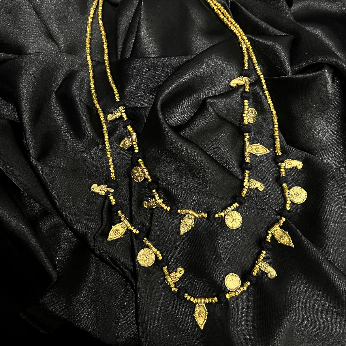 Handcrafted brass metal alloy Dhokra beads & threadwork. The Dhokra system of metal casting is said to be the oldest form of metal casting and is technically known as the ‘cire perdue’ or lost wax process. The casting technique revolves around replacing wax with molten metal by the traditional hollow casting method. Dhokra casting is currently practiced in tribal areas of India, primarily in Chhattisgarh and Odisha.