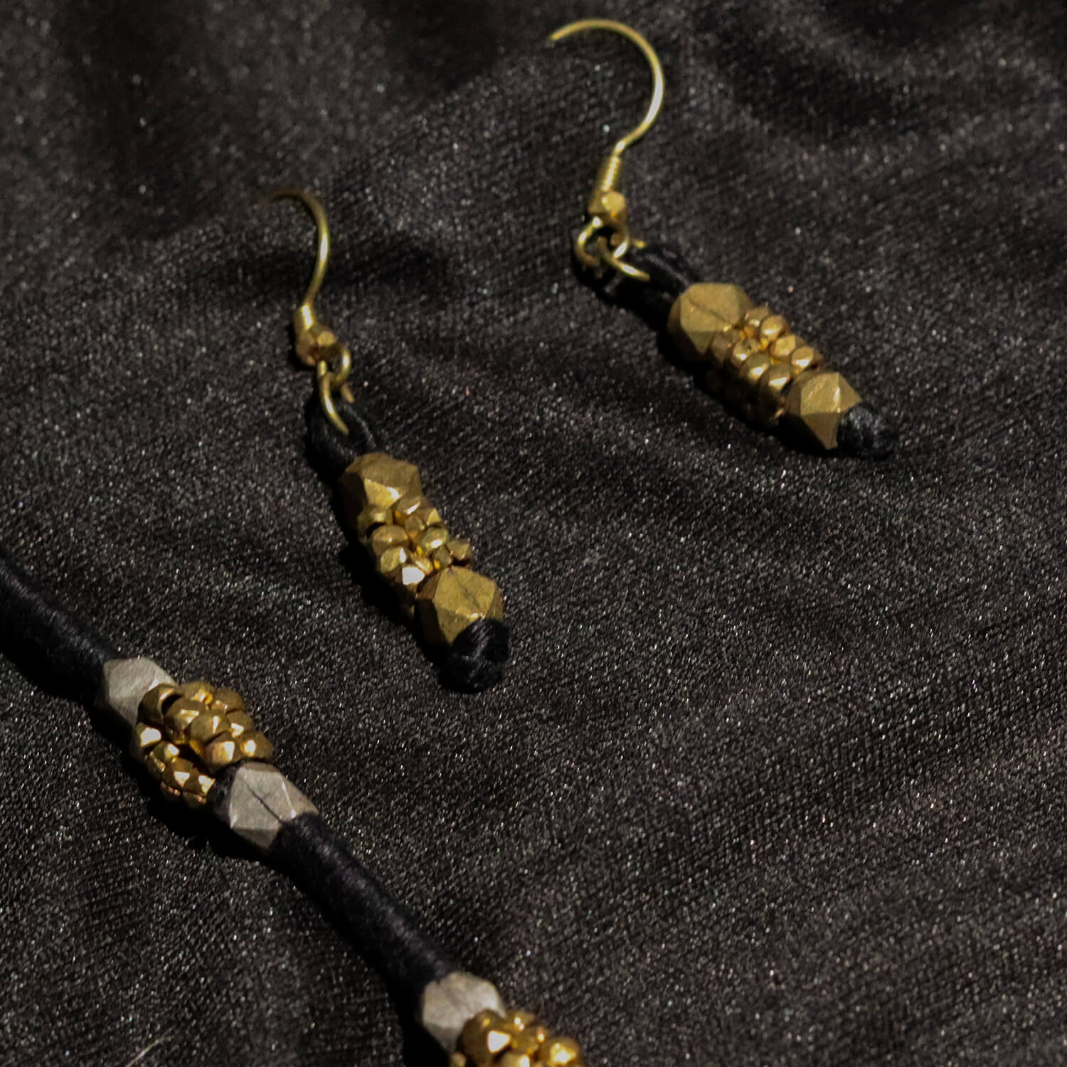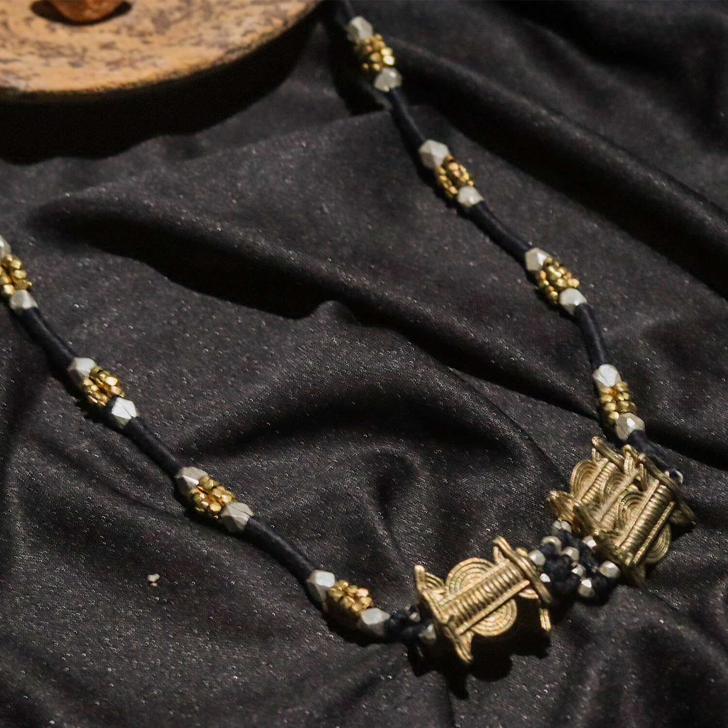 Handcrafted brass metal alloy Dhokra beads & threadwork. The Dhokra system of metal casting is said to be the oldest form of metal casting and is technically known as the ‘cire perdue’ or lost wax process. The casting technique revolves around replacing wax with molten metal by the traditional hollow casting method. Dhokra casting is currently practiced in tribal areas of India, primarily in Chhattisgarh and Odisha.