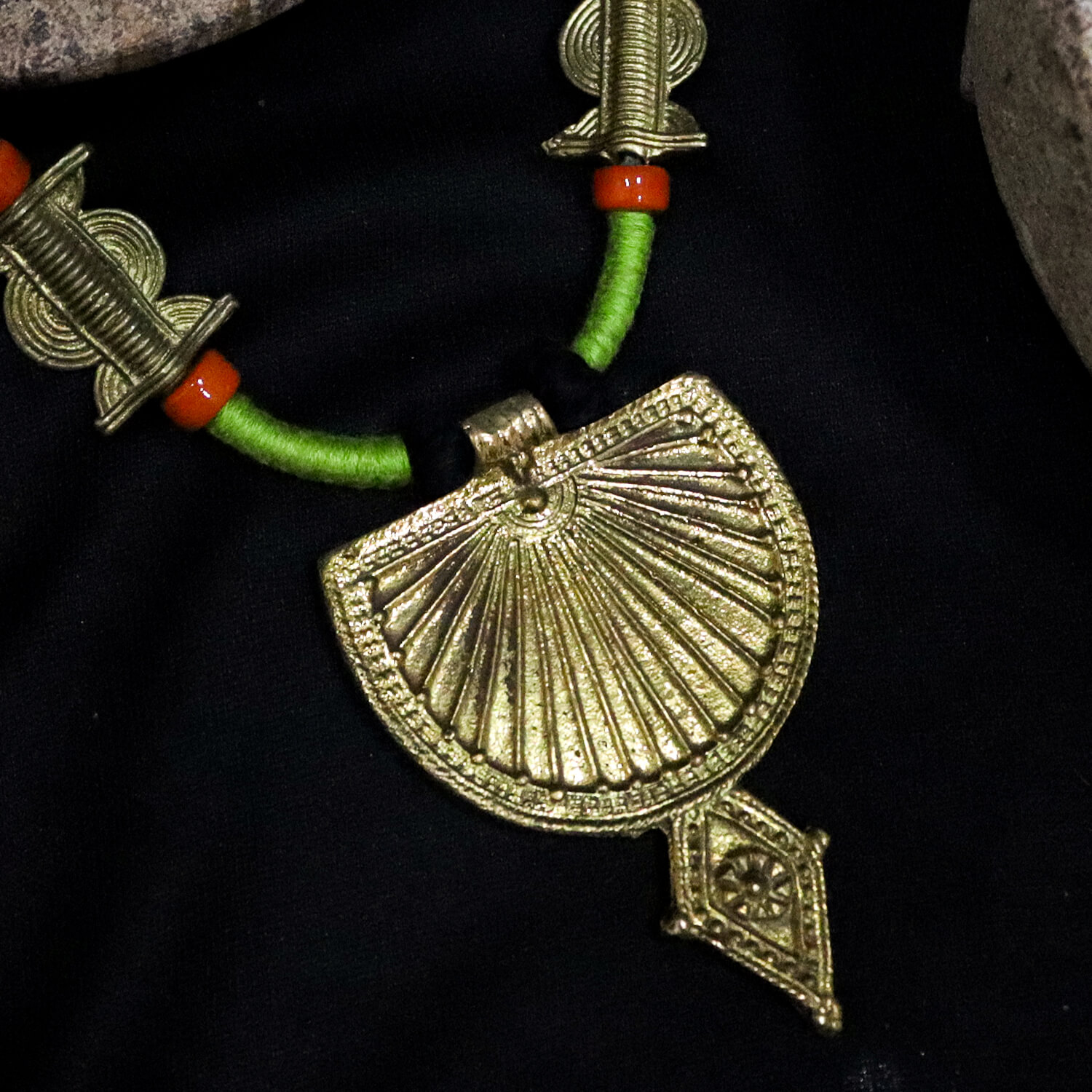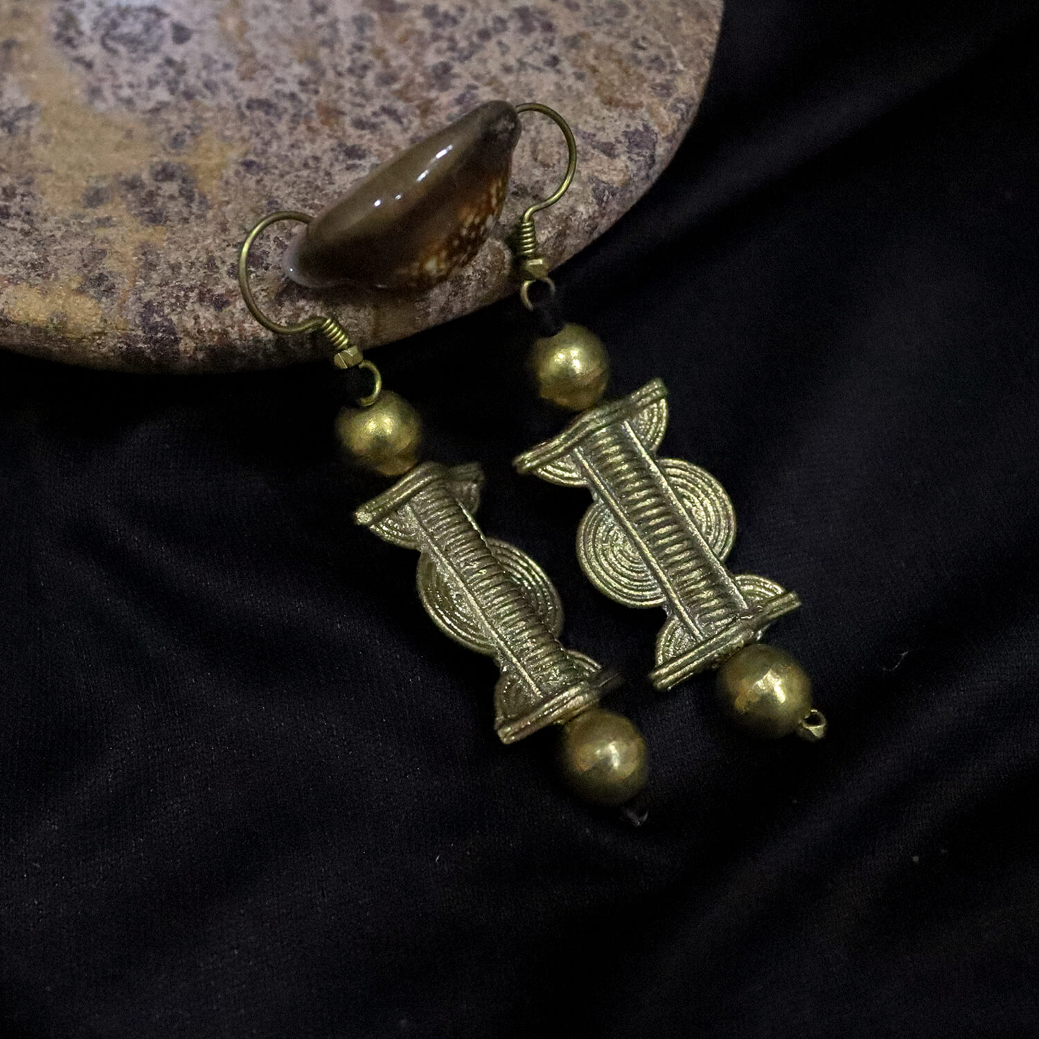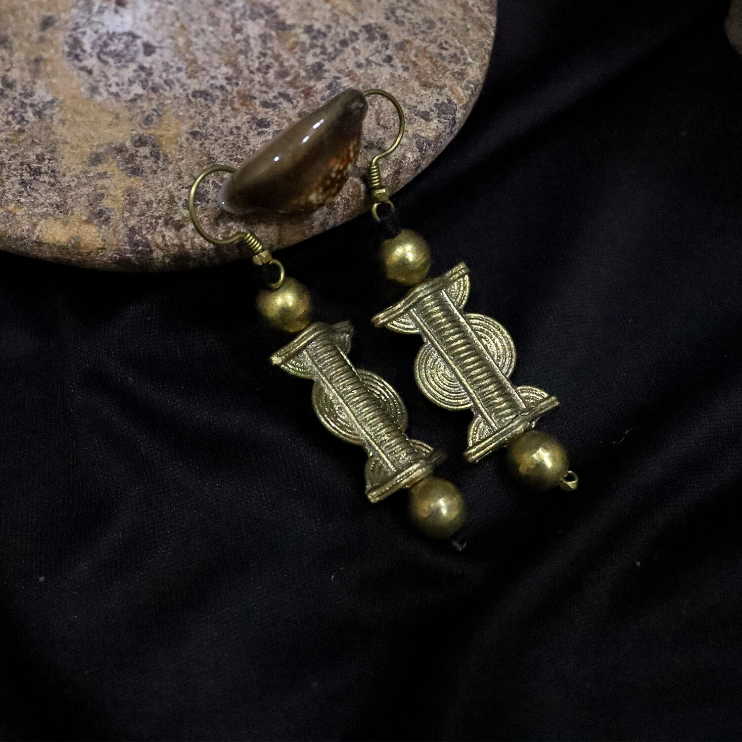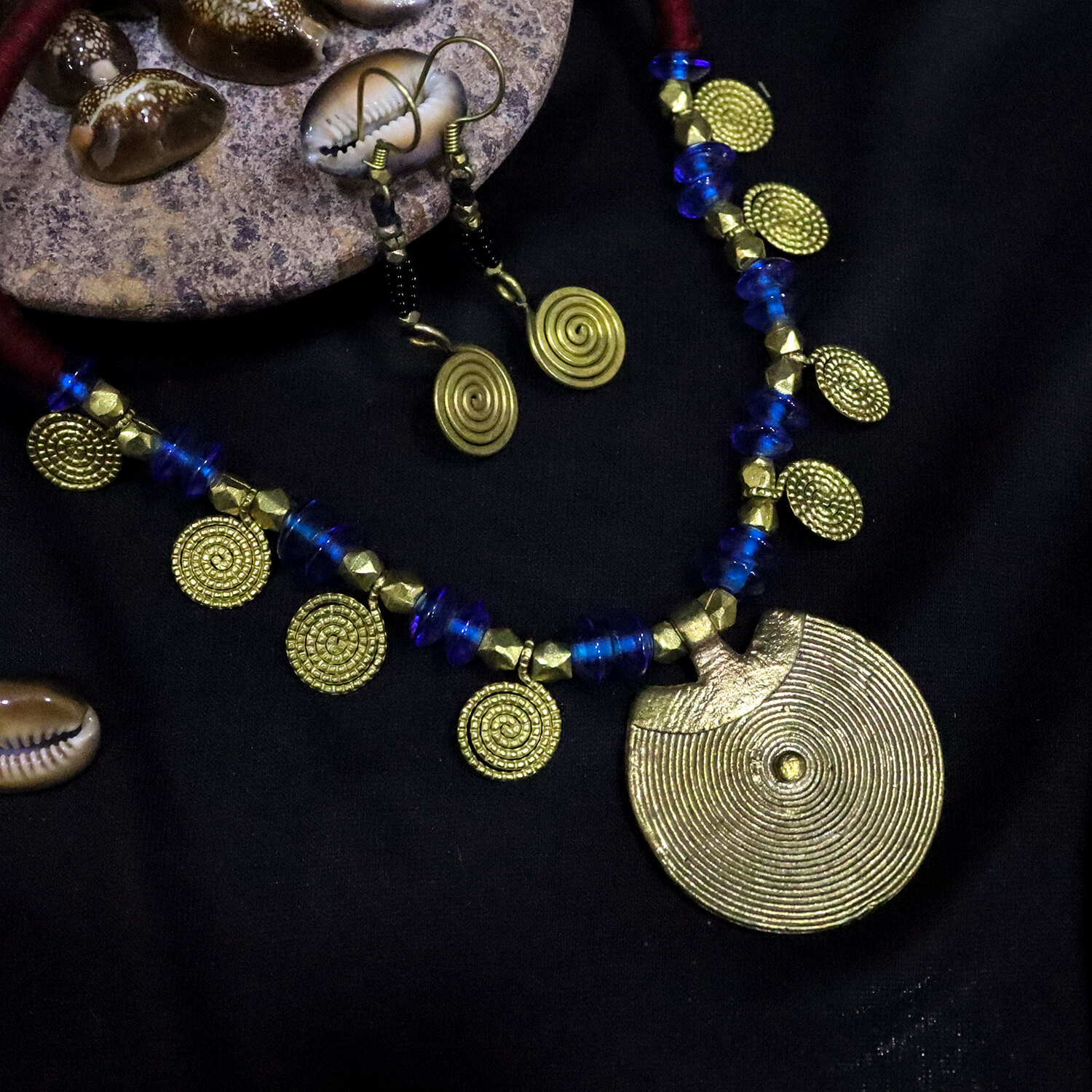 Handcrafted brass metal alloy Dhokra beads & threadwork. The Dhokra system of metal casting is said to be the oldest form of metal casting and is technically known as the ‘cire perdue’ or lost wax process. The casting technique revolves around replacing wax with molten metal by the traditional hollow casting method. Dhokra casting is currently practiced in tribal areas of India, primarily in Chhattisgarh and Odisha.