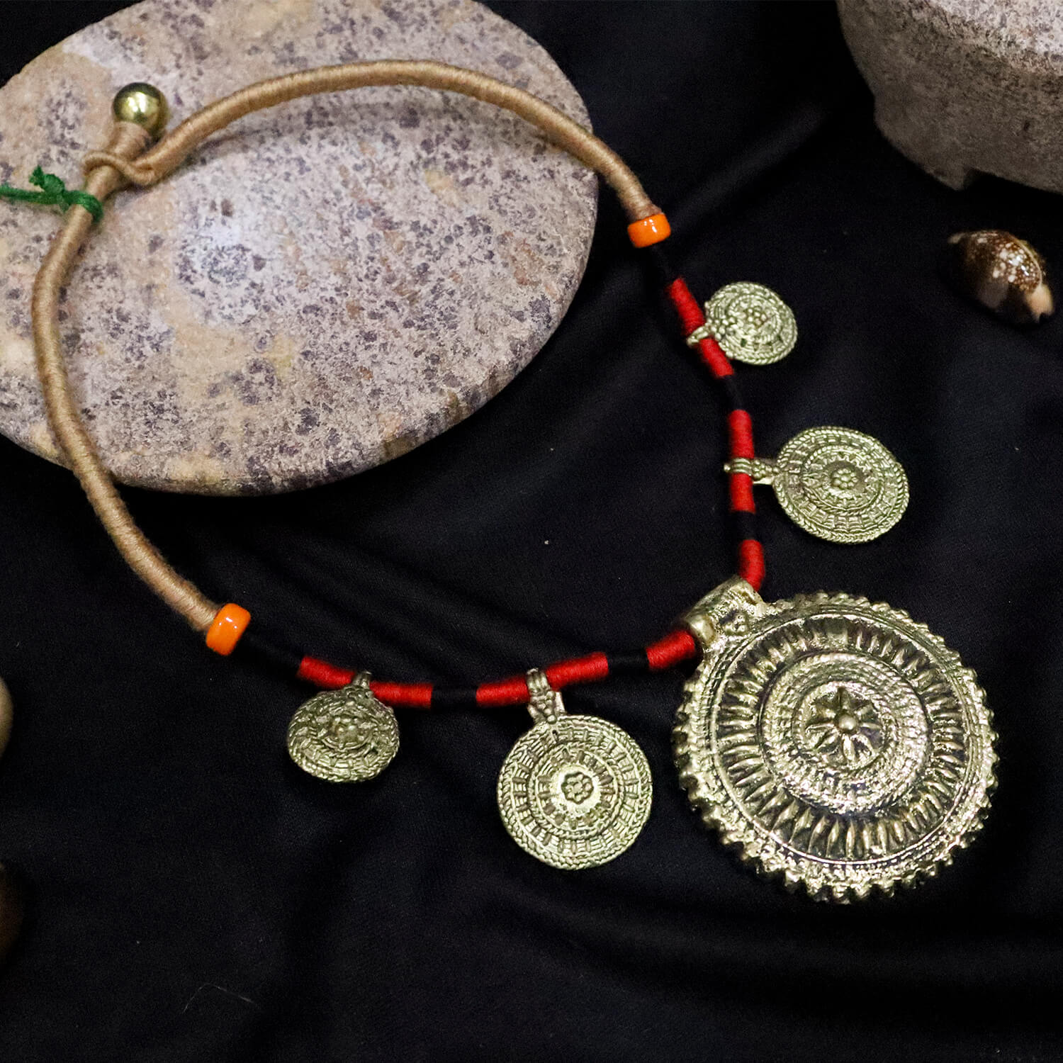 Stunning Dhokra tribal jewellery creation by Odisha’s master artisans that is both traditional and trendy. Every piece has its uniqueness engraved through the creative-making process which is held together with adjustable cotton thread.